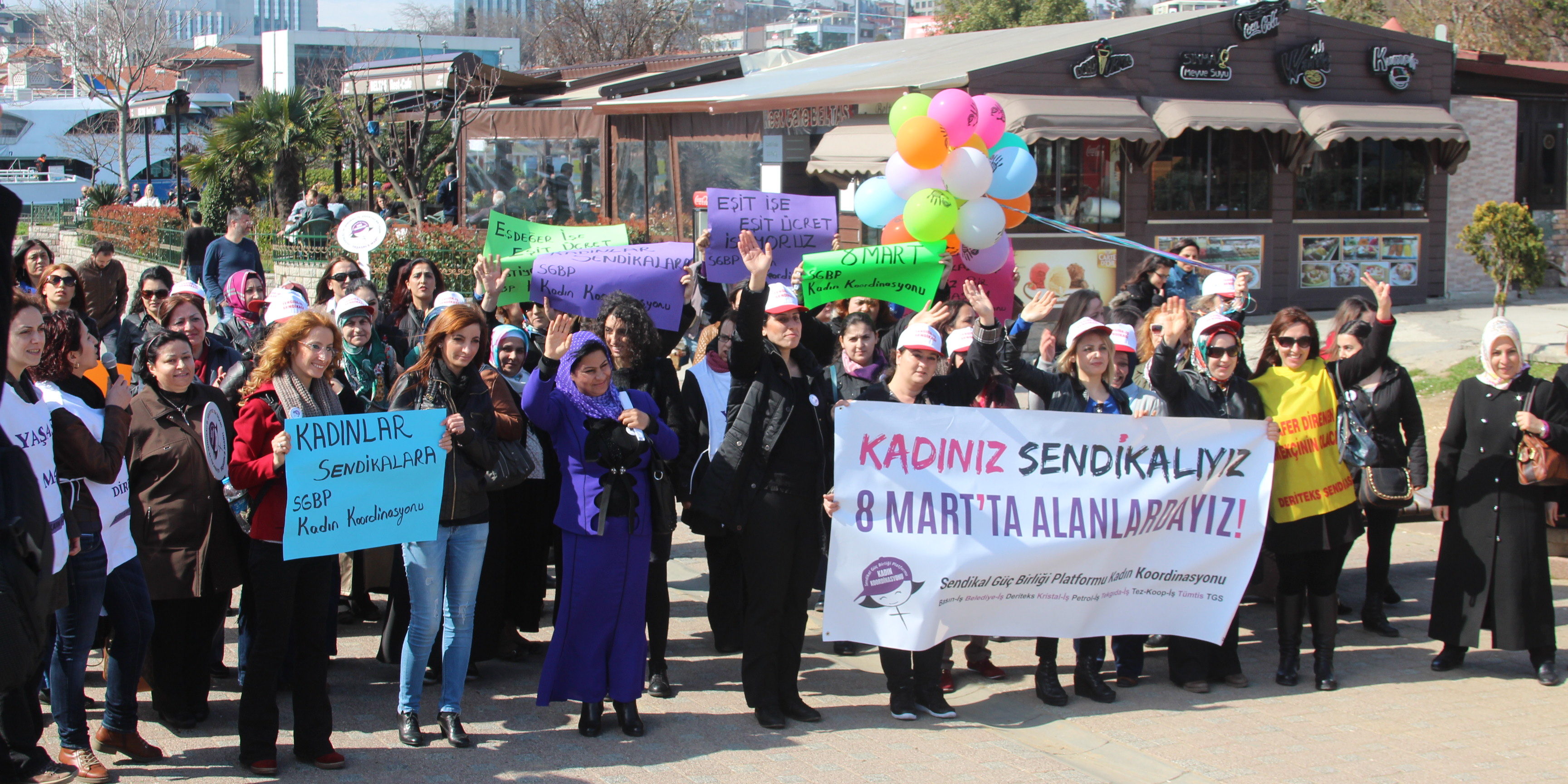 Tekneye turundan önce Beşiktaş’ta basın açıklaması yapan kadınlar, “Kadınız, sendikalıyız, 8 Mart’ta alanlardayız”, “Eşdeğer işe eşit ücret istiyoruz”, “Güvenceli ve sendikalı iş, şiddetsiz yaşam istiyoruz” yazılı pankart ve dövizler taşıdı. Afganistan Ulusal Sendikası’ndan kadınların da katıldığı açıklamada, “Kadınız, sendikalıyız, şiddete isyandayız”, “Yaşasın 8 Mart, yaşasın kadın dayanışması” sloganları atıldı.