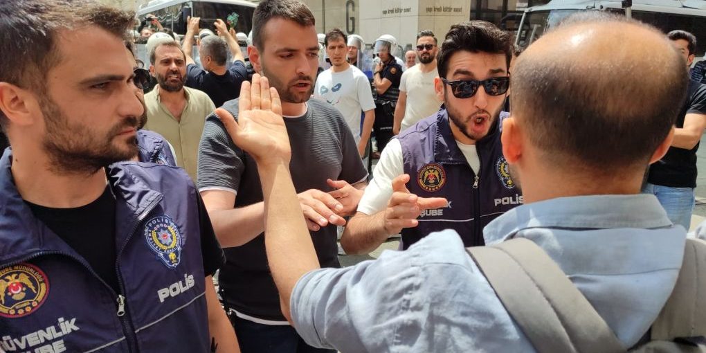 Bugün (17 Haziran 2023) yani Cumartesi Anneleri/İnsanları’nın 951. Haftasında Mezopotamya Ajansı’ndan bir meslektaşımız darp edilerek yere düşürüldü, kadın meslektaşlarımız kalkanlarla sıkıştırıldı ve tartaklandı, hak savunucularının gözaltına alınması sonrası polis çemberinin içinde basın açıklamasını okuyan HDP Eş Genel Başkanı ve milletvekili Pervin Buldan’a yaklaşmalarına izin verilmedi. Pervin Buldan polis çemberi dışında ikinci kez açıklama yaparken polis amirleri “Basını uzaklaştırın” diye emir verince, Buldan’ı dinlemeye çalışan basın mensupları kalkanlarla iki halka halinde çembere alındı. Bu çemberin içinde kalan basın mensuplarının hakarete uğradığı, kalkanlarla itilip kakıldığı görüldü.