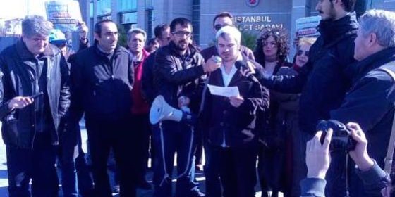 Evinin önünde yüzü maskeli bir kişinin saldırısına uğrayan, kafasına on, sol koluna da bir dikiş atılan Evrensel Gazetesi Yazarı ve İnternet Sitesi Editörü Mithat Fabian Sözmen’in uğradığı saldırıya dair savcılığa suç duyurusunda bulunmak için çok sayıda kişi Çağlayan Adliyesi önünde bir araya geldi.