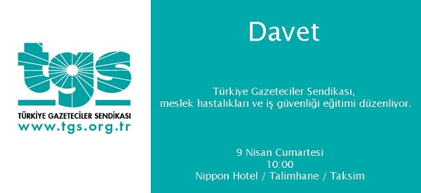 Türkiye Gazeteciler Sendikası olarak 9 Nisan 2016 Cumartesi günü Taksim/ Talimhane’de bulunan Nippon Hotel’de “Meslek Hastalıkları ve İş Güvenliği Eğitimi” düzenliyor. Düzenlenecek eğitime tüm gazeteciler…