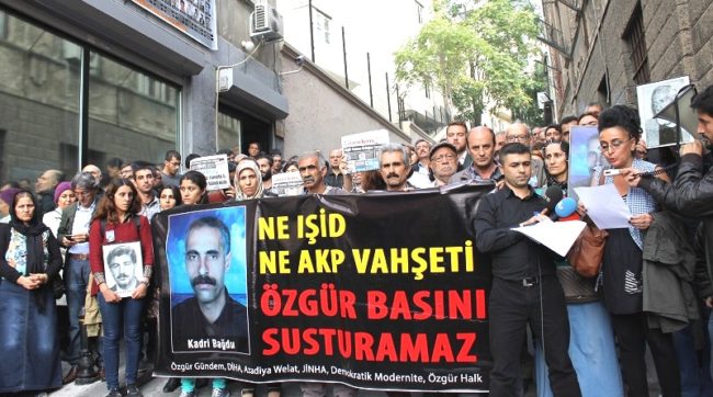 Basın emekçileri, Azadiya Welat dağıtımcısı Kadri Bağdu’nun faili meçhul şekilde katledilmesini protesto etti. Özgür Gündem binası önünde toplanan basın emekçileri, “Ne IŞİD Ne AKP vahşeti…