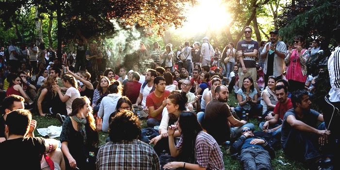 There is a mixed crowd on Gezi Park on a sunny weekday morning.