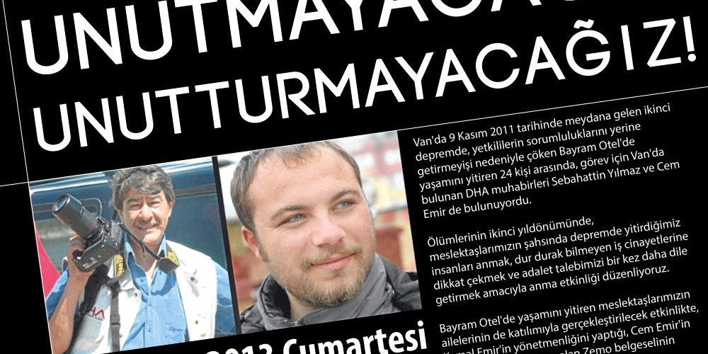 Van’da 9 Kasım 2011 tarihinde meydana gelen ikinci depremde, yetkililerin sorumluluklarını yerine getirmeyişi nedeniyle çöken Bayram Otel’de yaşamını yitiren 24 kişi arasında, görev için Van’da bulunan DHA muhabirleri Sebahattin Yılmaz ve Cem Emir de bulunuyordu.